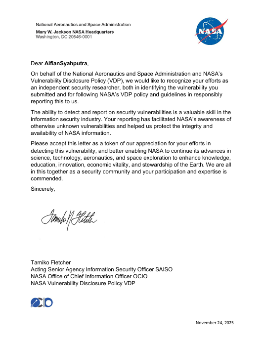 Alfian menerima surat penghargaan dari NASA, yang ditandatangani oleh Tamiko Fletcher, Acting Senior Agency Information Security Officer. Pengakuan ini diberikan atas usahanya sebagai peneliti keamanan independen yang berhasil mengidentifikasi dan melaporkan kerentanan siber sesuai dengan NASA’s Vulnerability Disclosure Policy (VDP).